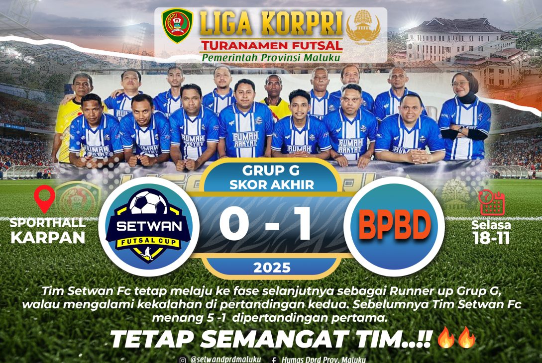 Dalam laga yang berlangsung pada Selasa, 18 November 2025, pukul 14:00 WIT, Setwan FC takluk di tangan Tim Badan Penanggulangan Bencana Daerah (BPBD) dengan skor tipis 0-1. Pertandingan yang digelar di Lapangan Futsal SoprtHall Karang Panjang itu berjalan alot, dan satu-satunya gol yang bersarang di gawang Setwan FC sudah cukup mengantar BPBD menjadi Juara Grup G.