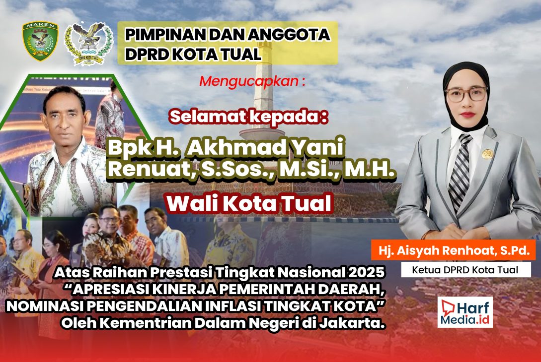“Atas nama seluruh anggota dan pimpinan DPRD Kota Tual, kami mengucapkan selamat dan sukses kepada Bapak Wali Kota H. Akhmad Yani Renuat dan jajaran atas penghargaan bergengsi dari Kemendagri ini,” ujar Hj. Aisyah Renhoat.