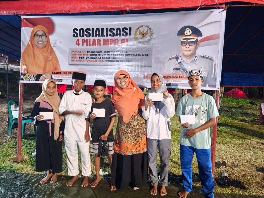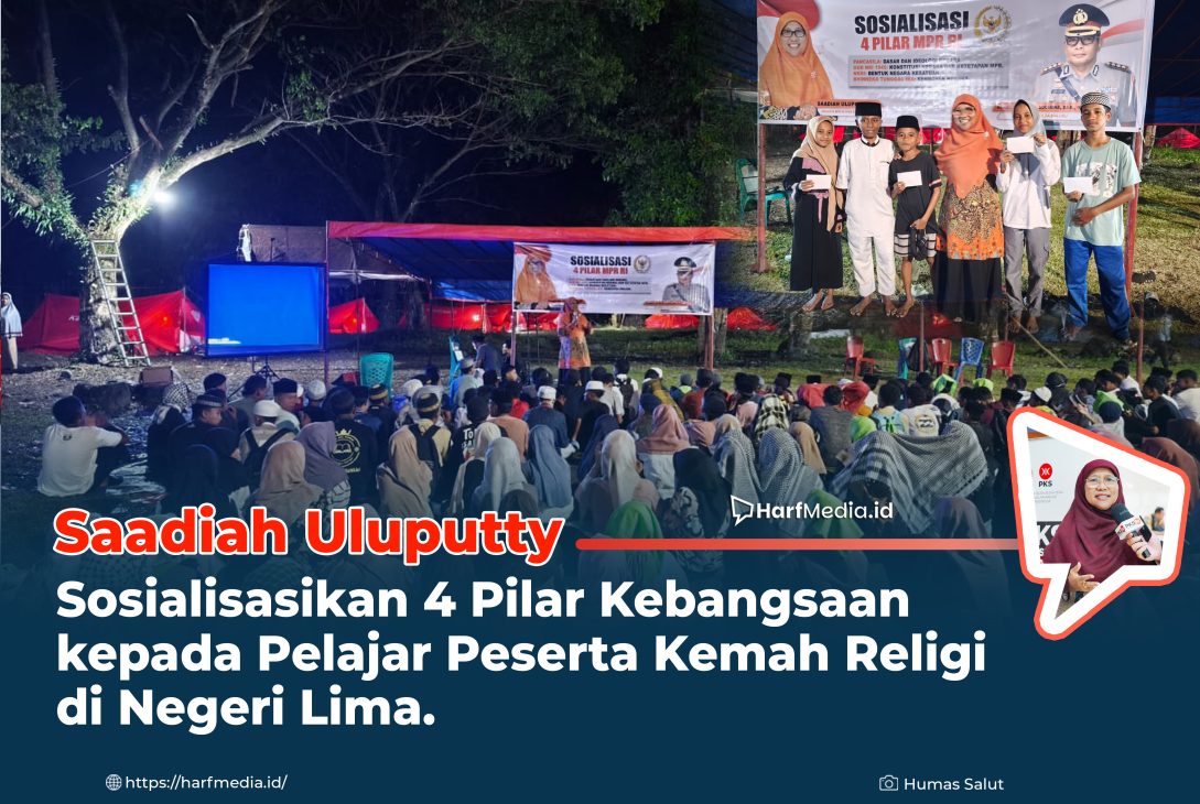 Maluku Tengah, HarfMedia.Id – Anggota MPR RI Daerah Pemilihan Maluku, Saadiah Uluputty, ST, melaksanakan Sosialisasi Empat Pilar Kebangsaan kepada pelajar SD, SMP, dan SMA di Negeri Lima, Kecamatan Leihitu, Kabupaten Maluku Tengah, yang tengah mengikuti kegiatan Kemah Religi Pelajar, Pada Selasa, 9 Desember 2025.